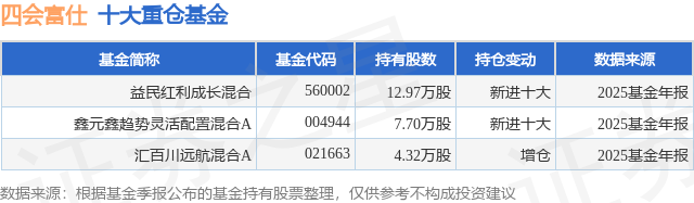 根据2025基金年报公募基金重仓股数据,重仓该股的公募基金共3家,其中持有数量最多的公募基金为益民基金的益民红利成长混合。益民红利成长混合目前规模为2.78亿元,最新净值0.6981(2月9日),较上一交易日上涨1.22%,近一年上涨4.26%。该公募基金现任基金经理为关旭。关旭在任的基金产品包括:益民服务领先混合A,管理时间为2023年9月28日至今,期间收益率为33.82%;益民核心增长混合,管理时间为2025年5月15日至今,期间收益率为24.22%。